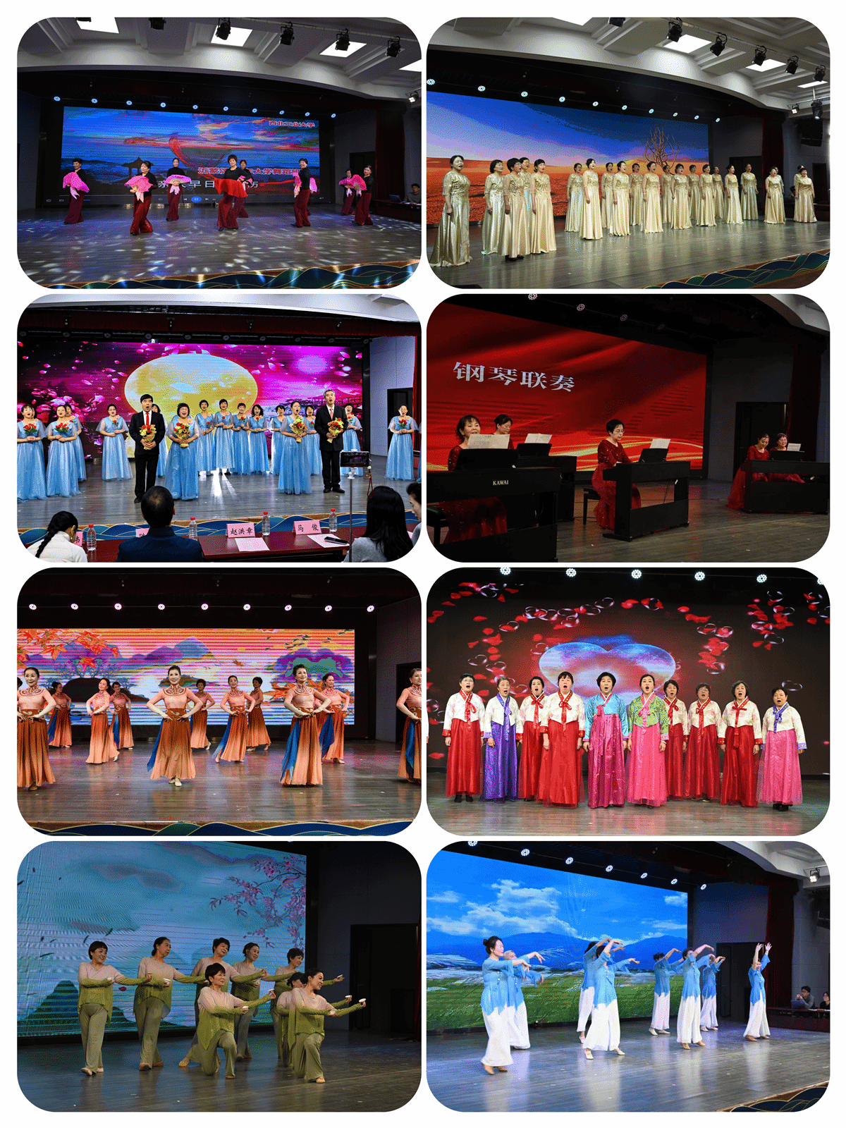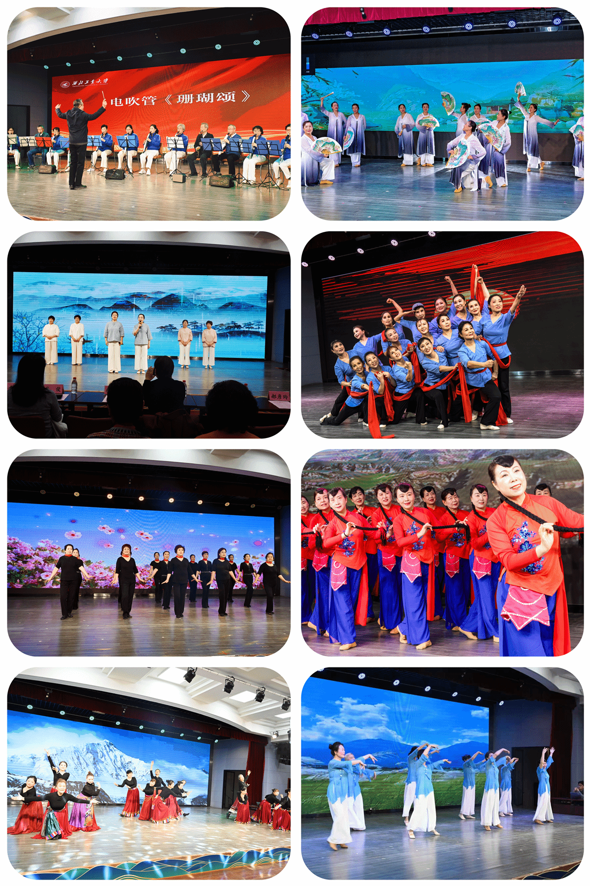 电钢琴班的演奏流畅动人,似潺潺流水浸润人心;声乐班深情献唱经典老歌,句句饱含真情,直抵心底;舞蹈班学员舞步轻盈、仪态优雅,将民族舞的醇厚韵味与现代舞的灵动活力巧妙融合;模特形体班则步履从容、自信展现出岁月沉淀后的从容风采;电吹管班技艺娴熟,一曲曲旋律尽显器乐之美;朗诵班声情并茂,字句铿锵,将文字化作情感洪流。本次活动邀请西安电子科技大学劲松艺术团舞蹈共同交流。她们带来的舞蹈表演情感饱满,地域特色鲜明,赢得了现场阵阵热烈掌声,也为整场活动注入了新鲜的艺术活力。