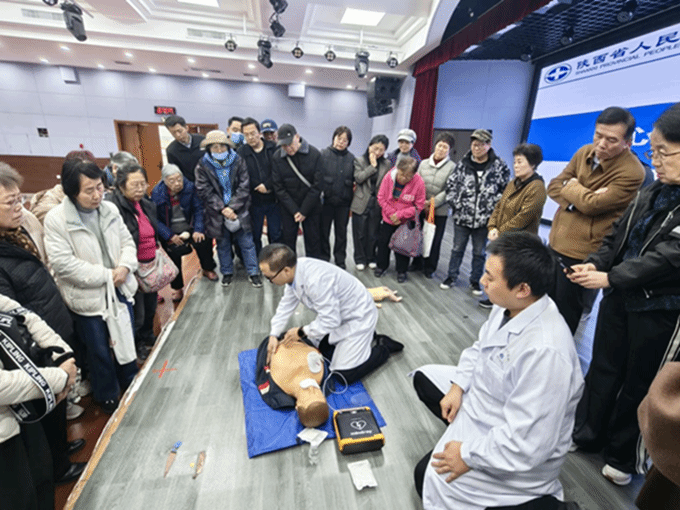 讲座现场,陕西省人民医院院前急救科护士长、副主任护师李兴珍结合老同志身体特点,围绕心肺复苏、气道异物梗阻两大应急场景,讲解急救知识并演示操作流程。之后,她带领团队开展实操培训,指导老同志练习相关急救操作、演示AED使用方法,引导大家动手实践。老同志们踊跃参与、积极提问互动,现场气氛活跃。本次培训有效提升了大家的应急救护能力,切实守护了老同志的身心健康,获得一致好评。