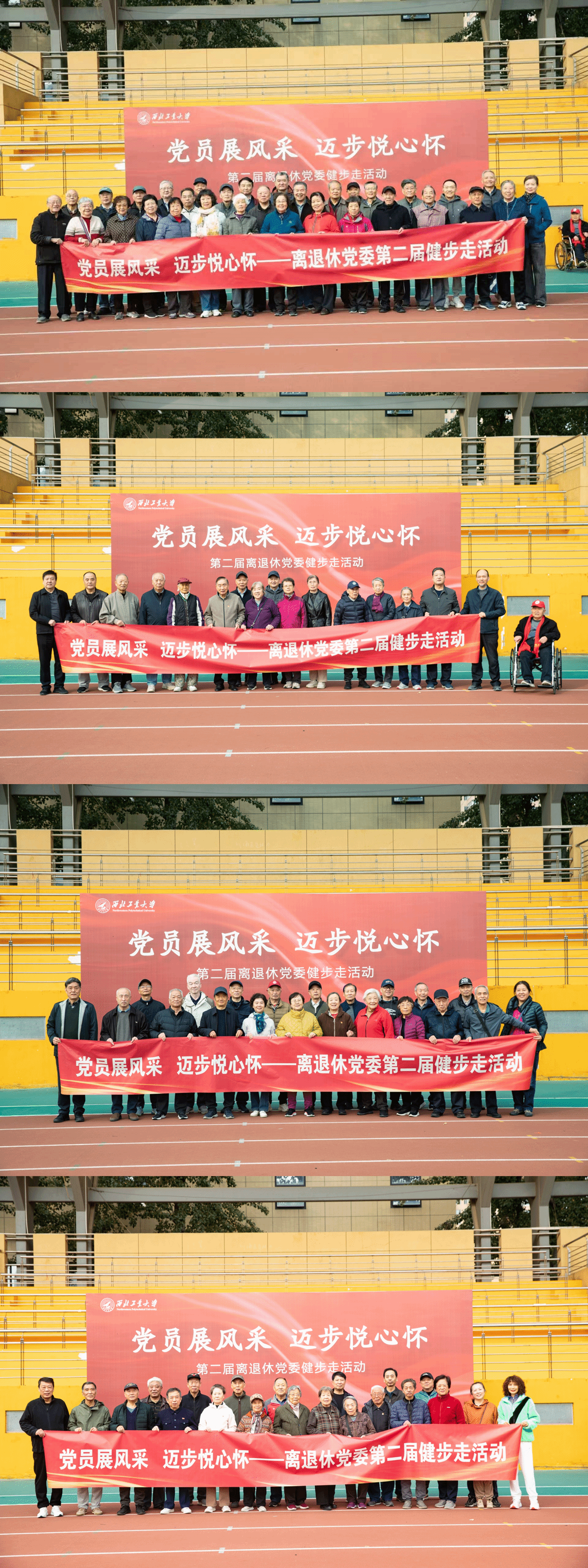 10月31日,离退休党委分别在友谊校区、南苑、西苑和长安校区家属苑举办“党员展风采 迈步悦心怀”健步走活动。