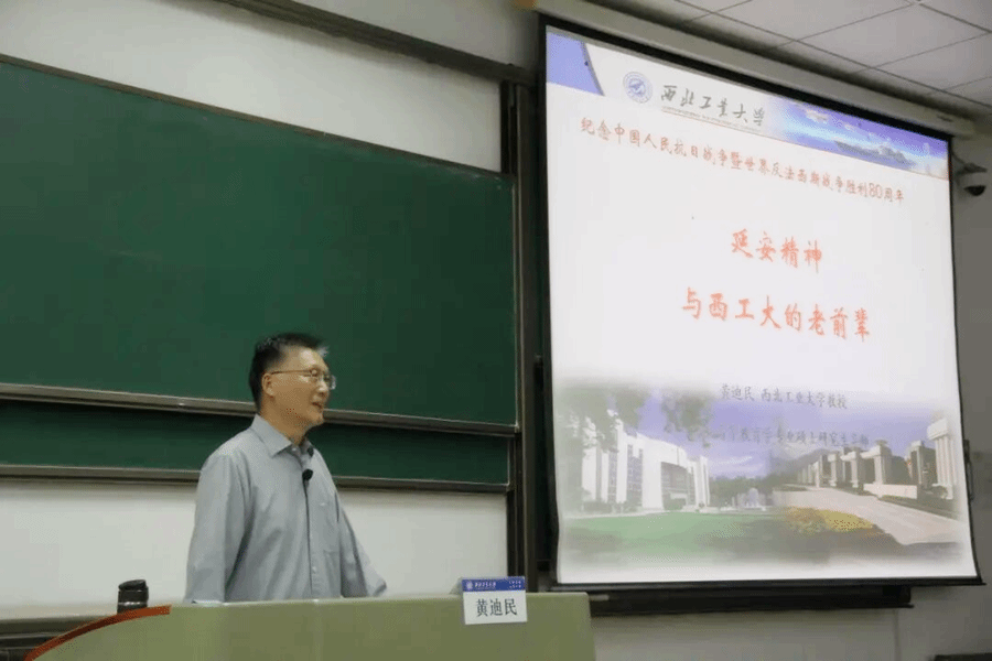 黄迪民以“延安精神与西工大的老前辈”为主题为新生讲思政课。学院党委书记杨妮花为黄迪民老师颁发“银发宣讲员”聘书。黄老师以中国人民抗日战争暨世界反法西斯胜利80周年为切入点,讲述革命战争年代学校的发展、学校老领导在战火中科研报国的故事,让同学们深刻感受到西工大精神的内涵,引发强烈共鸣,对学校有了更深的认同感、自豪感。